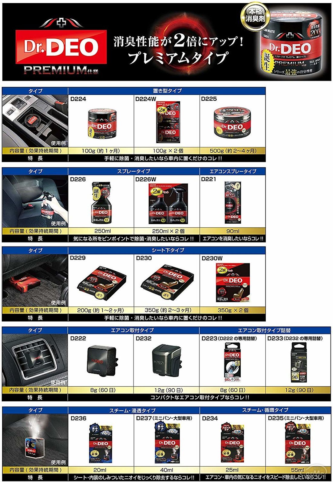 車用消臭・除菌剤 の 売れ筋ランキング #1 カーメイト 車用 除菌消臭剤 ドクターデオ DrDEO プレミアム スチーム 循環タイプ 使い切り 無香 5つ星のうち 38 4 ¥8 ¥2,6 #2 カーメイト 車用 除菌消臭剤 ドクターデオ DrDEO プレミアム シート下タイプ大型 無香 安定化二酸Nov 11, · 置き型タイプのおすすめ商品 車全体に広がった臭いの対策には、置き型タイプをどうぞ。 ダッシュボードやドリンクホルダーなど、平らなところに置いて使ってください! drdeo(ドクターデオ)プレミアム置きタイプ 無香消臭剤 車 除菌 二酸化塩素 車 置き型 大型 おすすめ カーメイト D225 ドクターデオ プレミアム 置きタイプ 内容量500g 無香タイプ。消臭剤 車 除菌 カーメイト D225 ドクターデオ Dr DEO プレミアム 置き型 大型 内容量500g 無香 安定化二酸化塩素 carmate